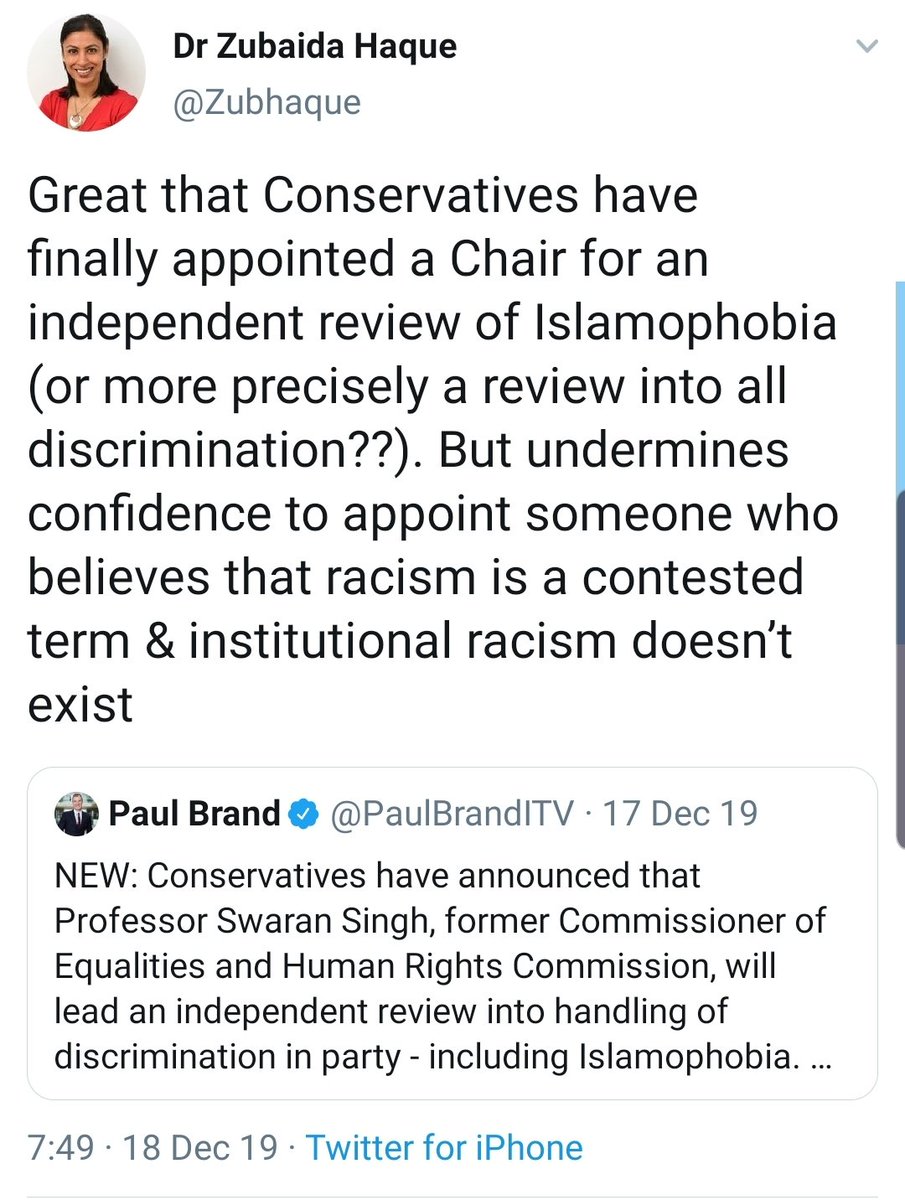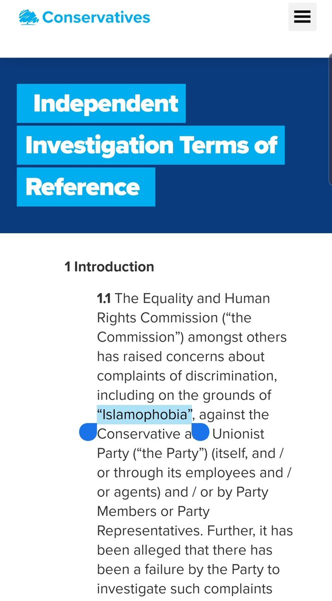 At the top of the Terms of Reference for their complaints assessment into discrimination, the Conservatives put Islamophobia in inverted commas.