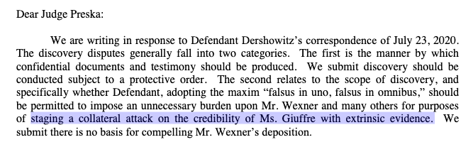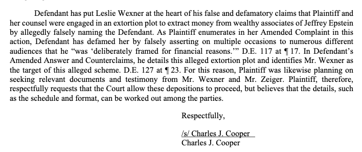 Both Giuffre and Dershowitz believe that Les Wexner and his lawyer have info supporting their cases.