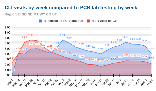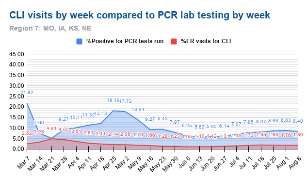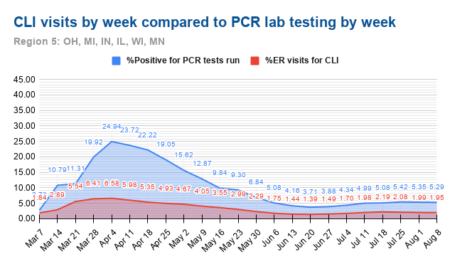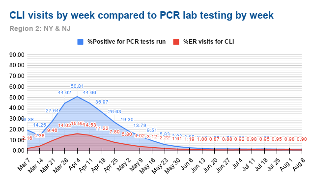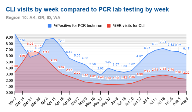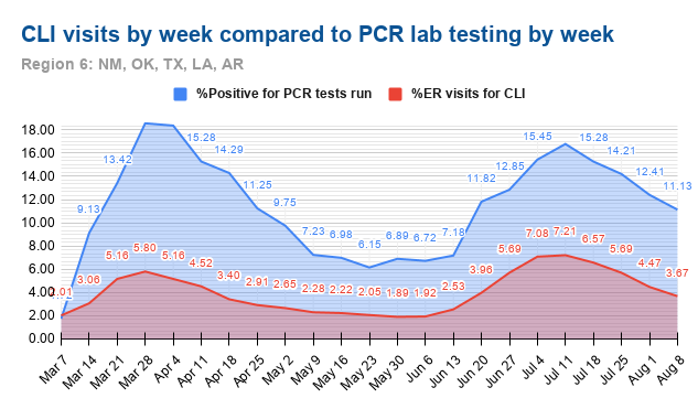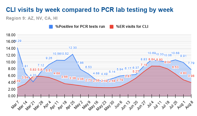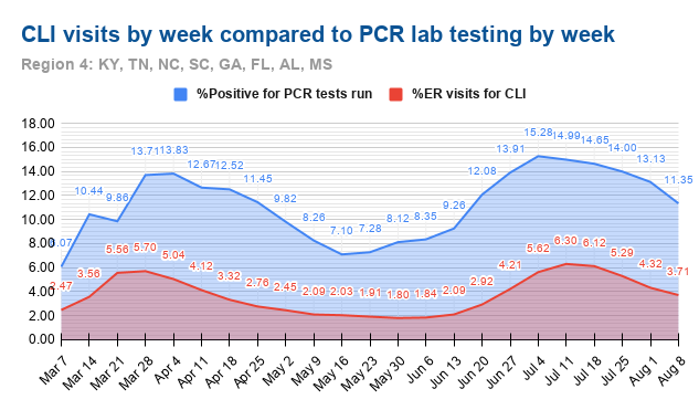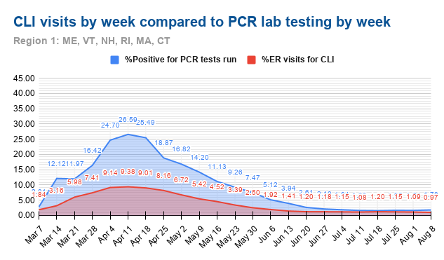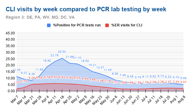 So here is a look at the incredible symmetry (especially last two months) in rate of positive PCR tests (by lab collection/test date rather than when reported) and pct. of ER visits showing CLI symptoms. Sources: CDC/HHS PCR timeseries and NSSP CLI data.