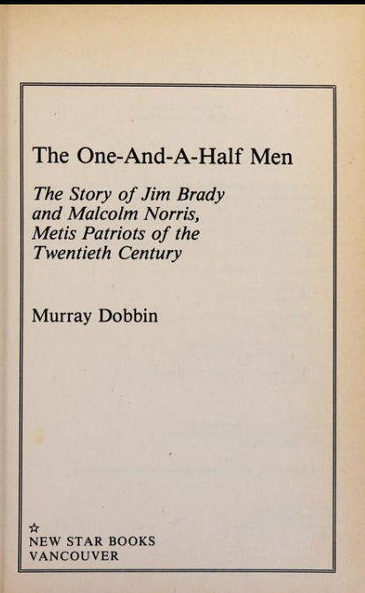 The one-and-a-half men- the story of Jim Brady and Malcolm Norris, Metis patriots of the twentieth century-Dobbin, Murray-1981- Brady knew that a reinterpretation of Canadian and Metis history would not suffice to persuade the commissioners that “relief” was an inadequate
