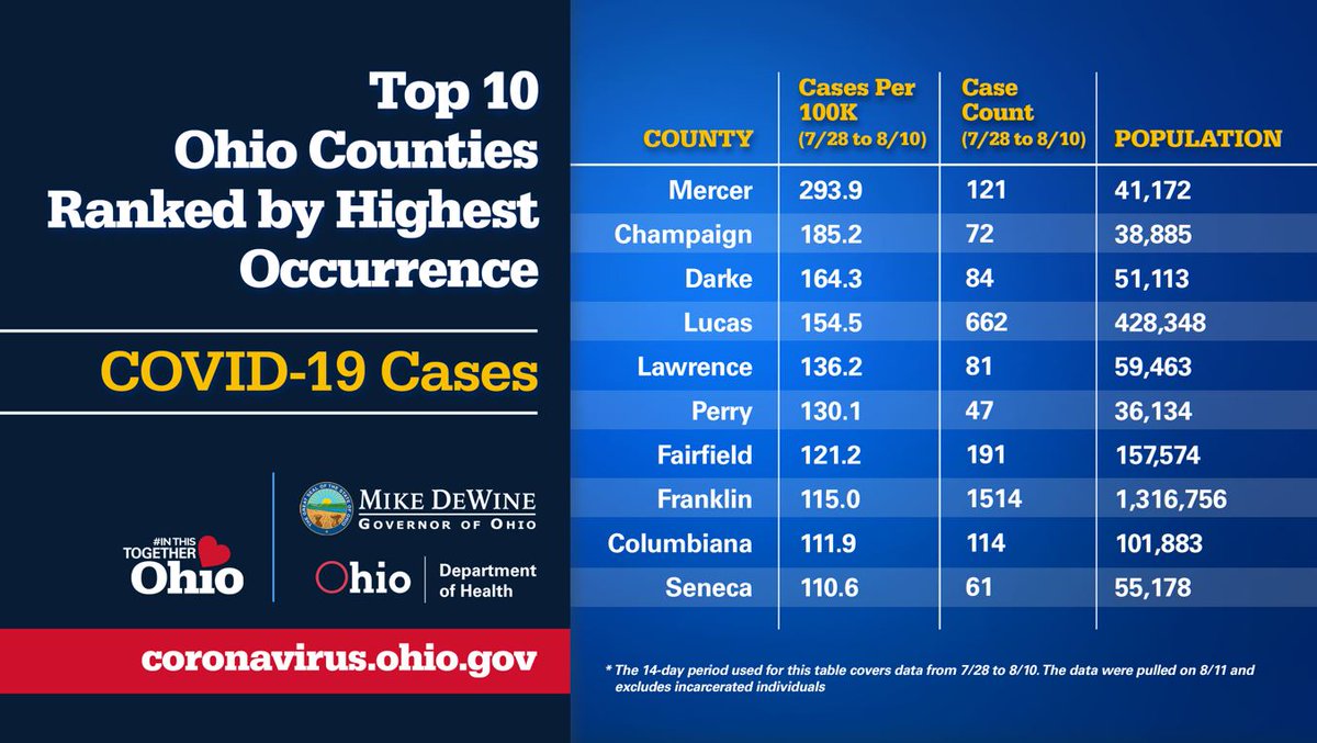 Ohio's counties ranked by order of the number of cases in the last two weeks per 100,000 population. ⬇
