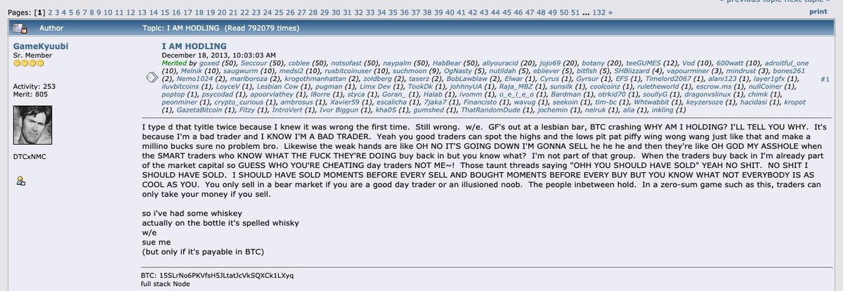 En 2013, cuando Bitcoin sufrir grandes caídas en sus precios, el usuario de BitcoinTalk, GameKyuubi, escribió un hilo que iniciaba con la siguiente expresión “I AM HODLING” 👇