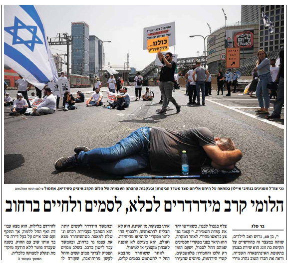החלה חסימה ברחוב קפלן, כמה מפגינים יושבים על הרצפה. יש גם קריאות להתחיל לצעוד לכיוון איילון