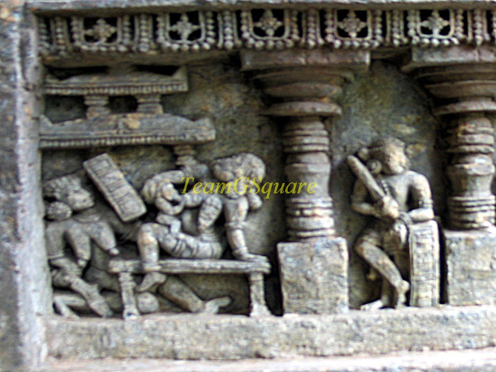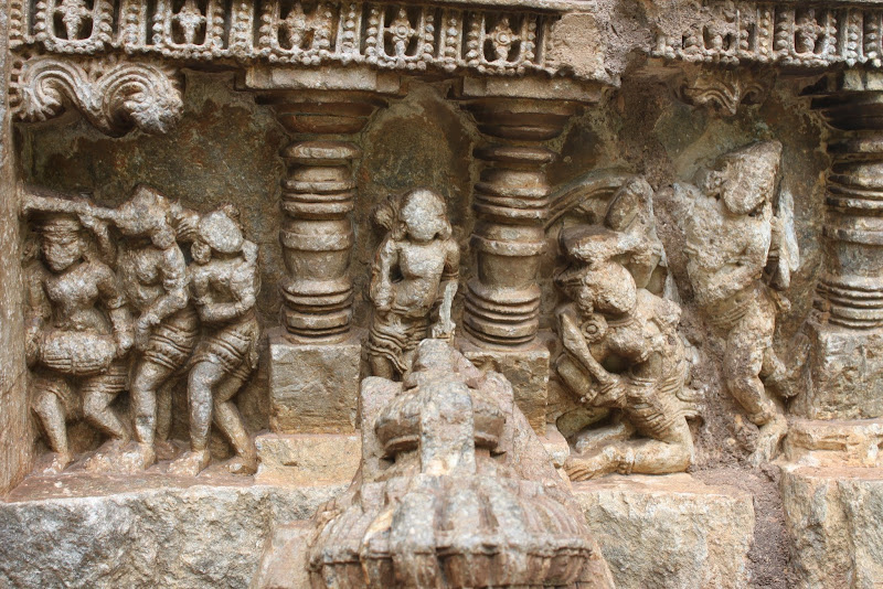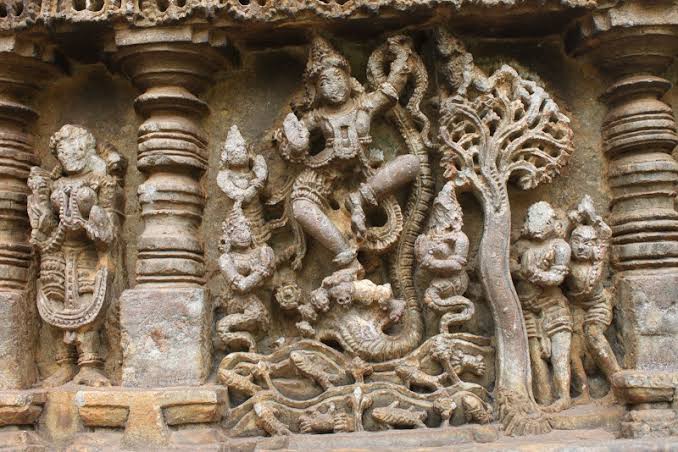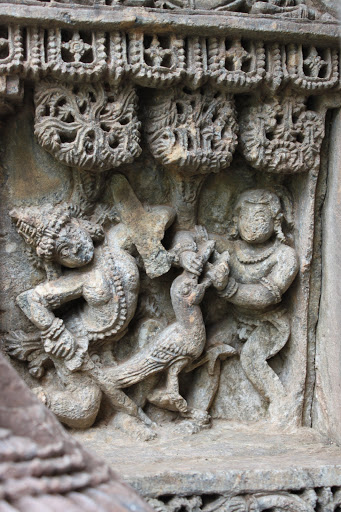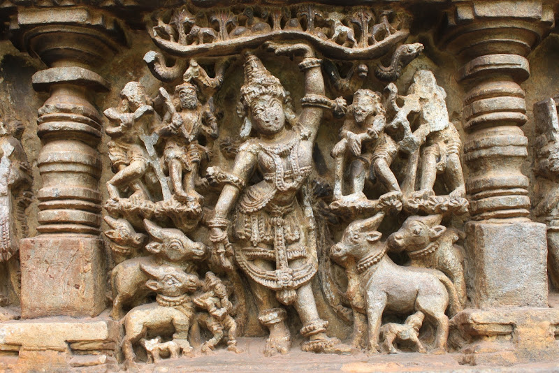 To the right of north entrance, we find 25 panels related to Krishna Lila as depicted BhagavataPuran rest 45 panels depicts early events of Mahabharata.The panels of Krishna-lilas start with his birth in prison ends with end of Kamsa in the hands of Krishna.