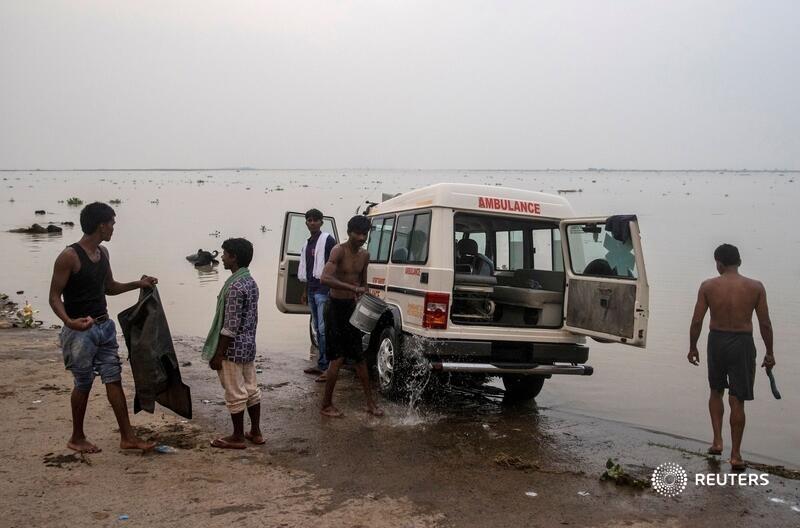 Life goes on inside & outside the hospital as #coronavirus cases rise. Several ambulances are washed daily in the river Ganges behind the hospital.