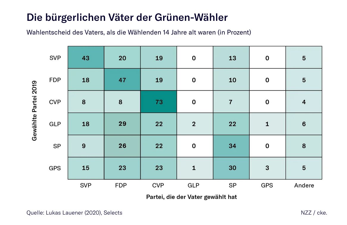 🗳️🇨🇭 En #Suisse, une majorité des jeunes électeurs votent comme leurs parents, à l'exception des jeunes électeurs écologistes majoritairement (2/3) socialisés dans des familles ... de droite nzz.ch/schweiz/sag-mi…
