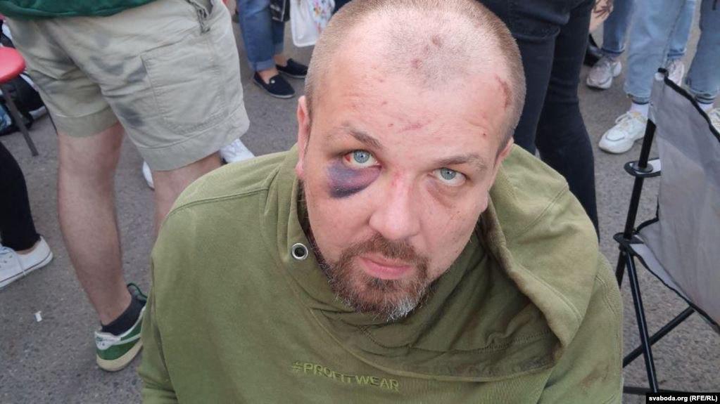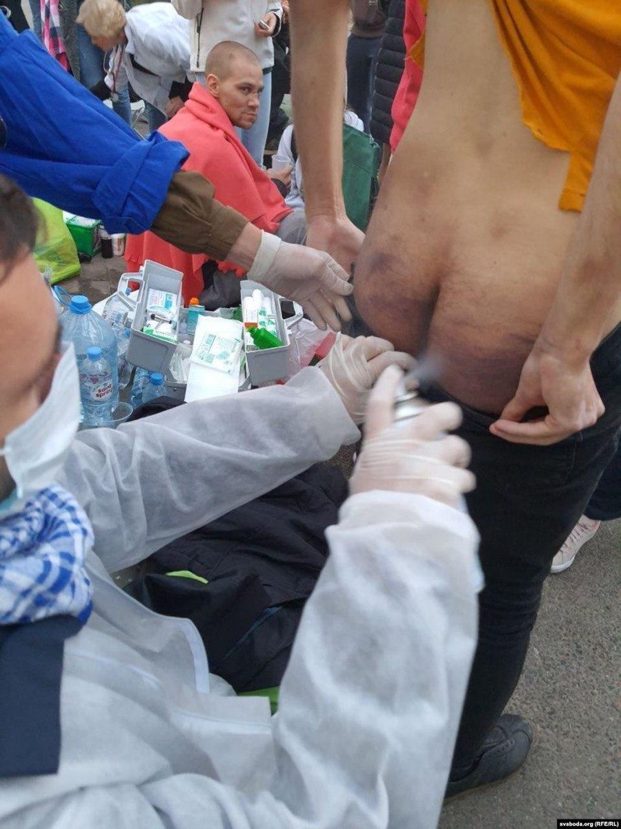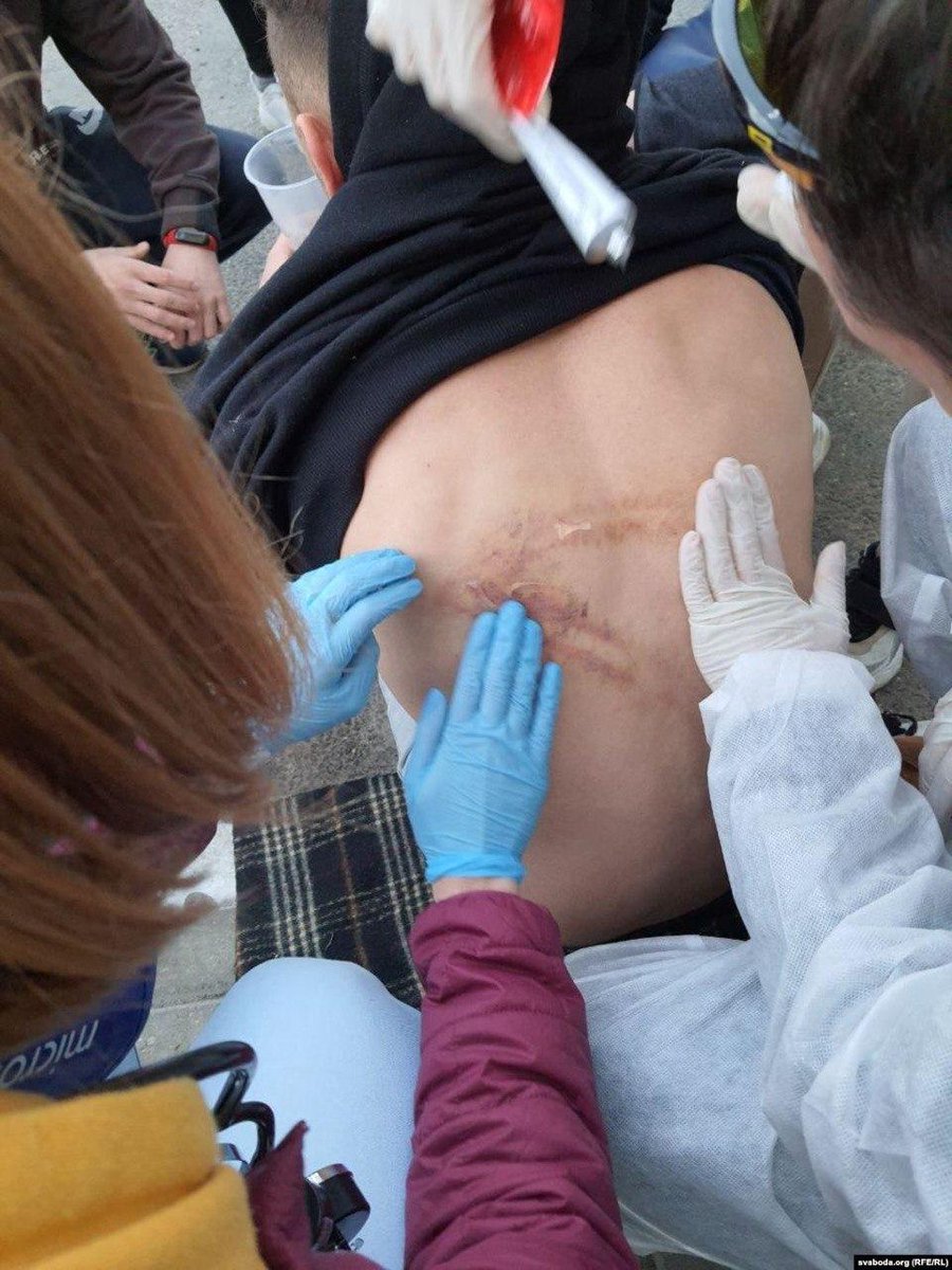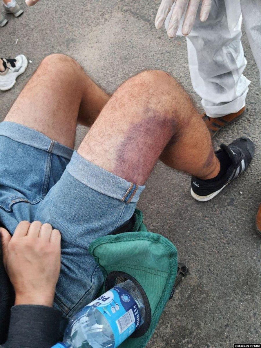 This guy claims that he was helping paramedics to load the wounded man to the ambulance when the riot police attacked him from the back and hit him with something heavy
