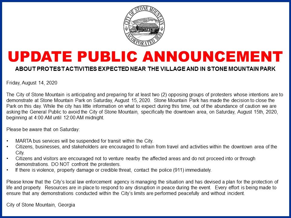 Breaking: Stone Mountain will be CLOSED tomorrow.