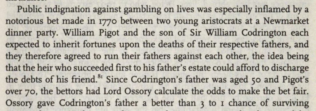 3. Or take the notorious example in which two aristocrats bet on the deaths of their own fathers, on the theory that whichever first came into his rich inheritance could support the other
