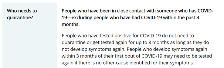 "People who have tested positive for COVID-19 do not need to quarantine or get tested again for up to 3 months as long as they do not develop symptoms again."