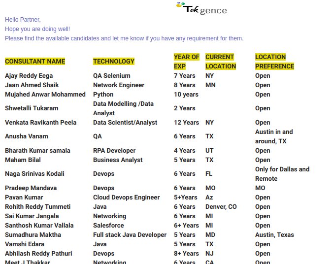 Tekgence, an H-1B dependent firm, sends an email out to prospective clients containing a list of H-1B/OPT workers (all from India) available for LEASING.