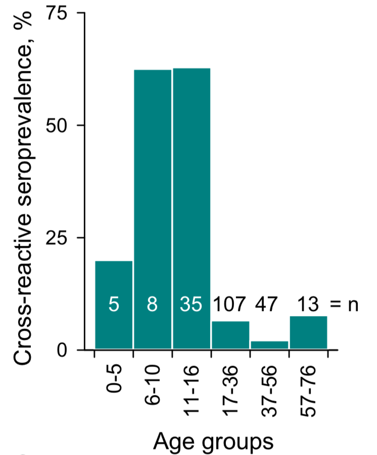 Then there's children. There's evidence they may be less susceptible to infection (nature.com/articles/s4159…) and younger groups not previously exposed to SARS-CoV-2 have cross-reactive antibodies, which may help explain reduced risk (biorxiv.org/content/10.110…). 5/