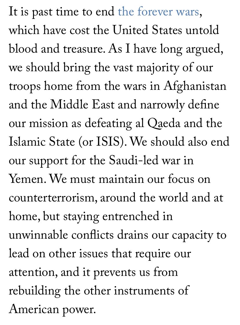 2. He is planning on ending “forever wars”(not clear how though) but counterterrorism in safe havens and weak states will continue: