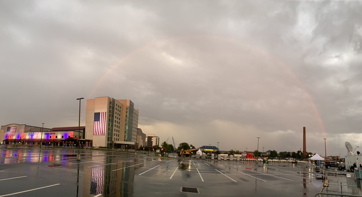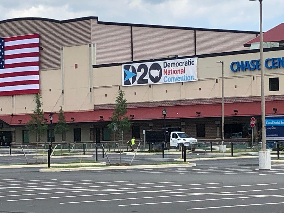 Exciting development here at the Chase Center in #Wilmington. A tree that was obscuring the @DemConvention sign has been removed. TV networks are happy. (Must have been easier than moving the sign...)