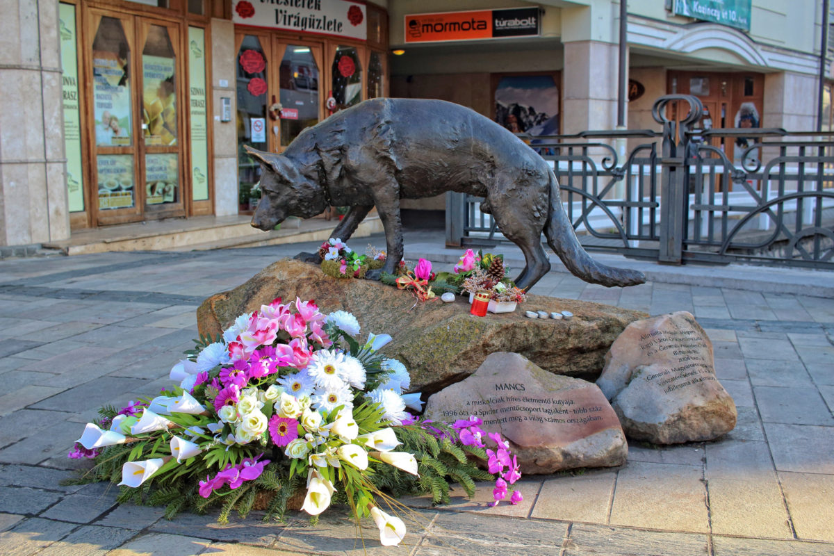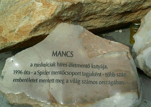 Heykelinin altında bulunan taşta işe şunlar yazıyor: "Mancs. Miskolc'luların ünlü hayat kurtaran köpeği. 1996'dan beri "Spider Kurtarma Ekibi" üyesi. Dünya'nın çeşitli ülkelerinde 100'den fazla insanın hayatını kurtardı."