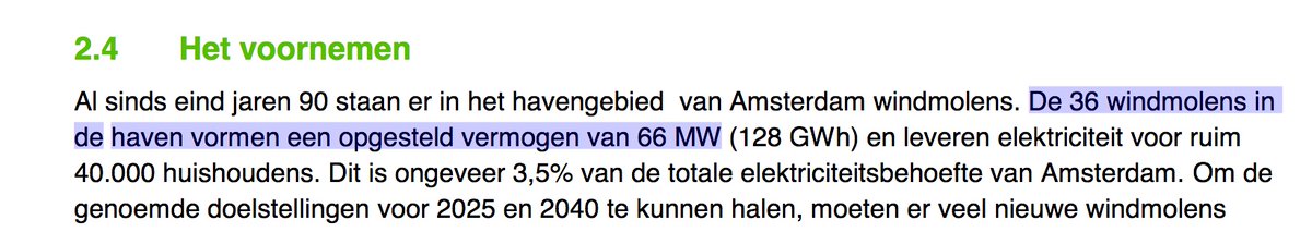 Die ambitie van het college (GroenLinks, D66, PvdA en SP) staat in de Routekaart Amsterdam Klimaatneutraal 2050 (maart 2020). Daarin staat ook hoeveel 'wind' Amsterdam nu heeft: 38 turbines (66 MW totaal). 2/6