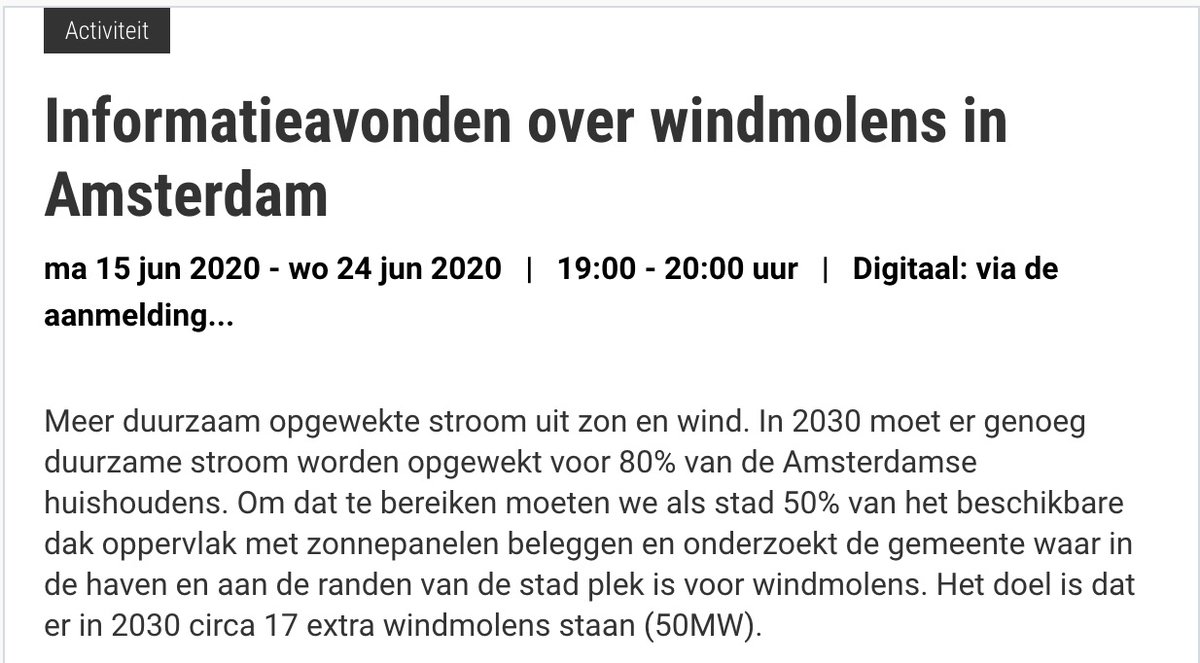 Draadje over trekken aan dood paard dat ’windenergie in Amsterdam’ heet. In juni waren er zes (digitale) informatieavonden. De gemeente, onder aanvoering van wethouder Marieke van Doorninck (GroenLinks), wil dat er in 2030 17 extra windmolens staan, samen goed voor 50 MW. 1/6