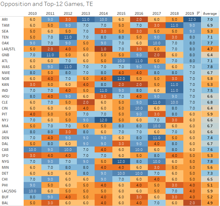 Dito isto, vamos olhar o ano passado em jogos top-12 cedidos, ou seja, no ponto de vista da defesa, bem como nos últimos 9 anos (PPR).