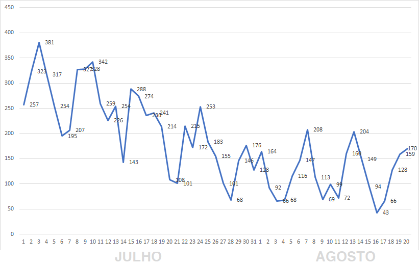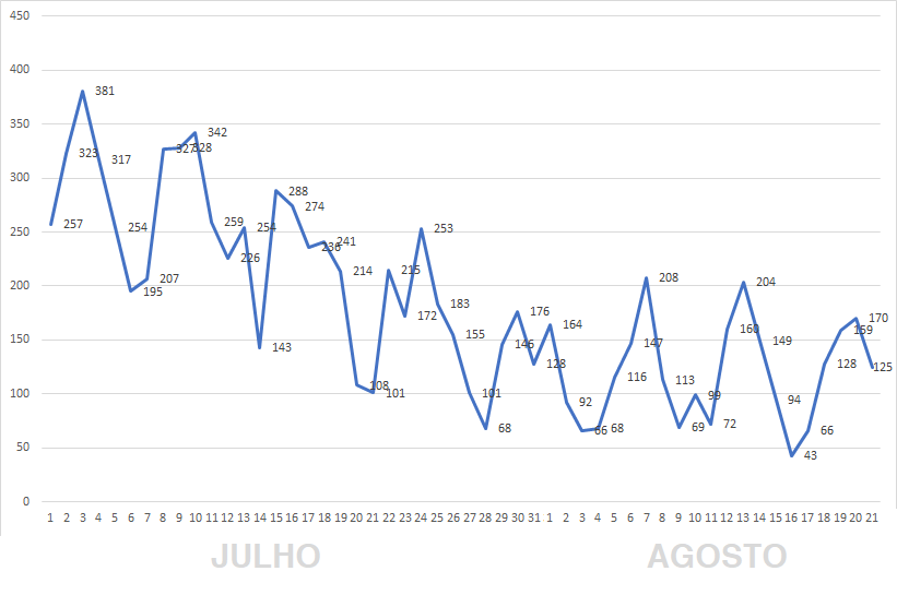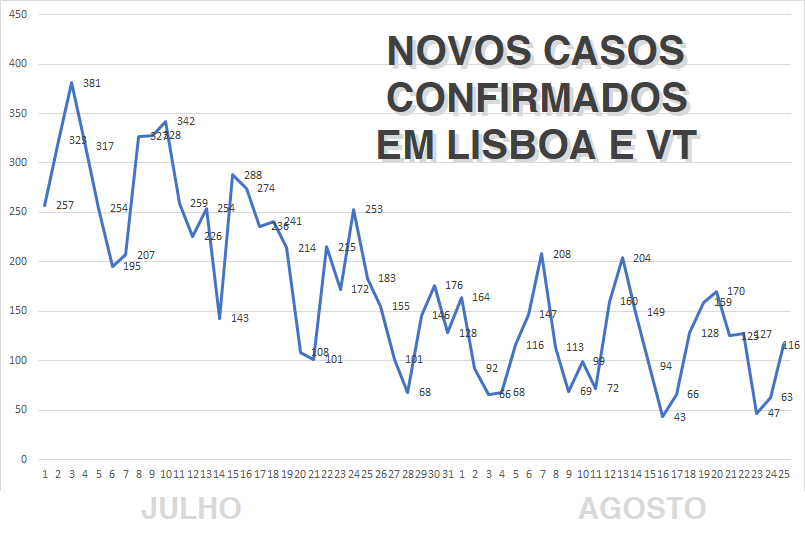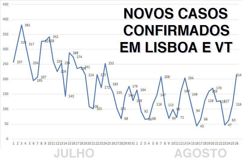 Para a malta que (como eu) vê as suas viagens restringidas por ter passado tempo numa zona laranja (Lisboa e Vale do Tejo), segue o gráfico dos casos confirmados pela DGS ao longo deste mês.