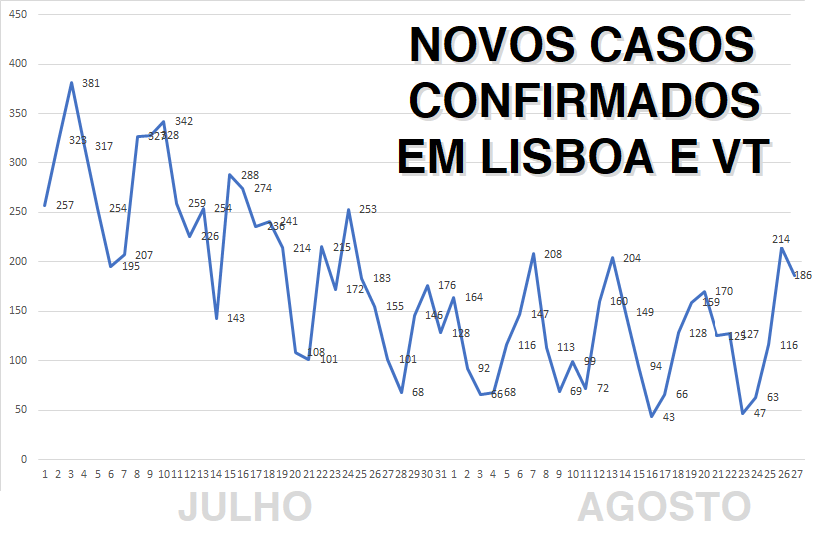 Uma visão mais alargada dos últimos 2 meses, para verificar a tendência de casos confirmados em Lisboa e Vale do Tejo. #covid19LVT