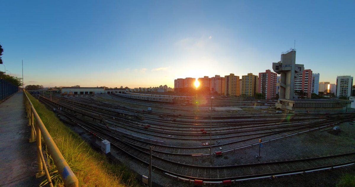 Viviane Veiga – pôr do sol no Pátio Jabaquara mostra as vias em destaque com dois trens ao fundo, galpões à esquerda e a torre de controle à direita, com prédios ao fundo e o sol se pondo entre eles