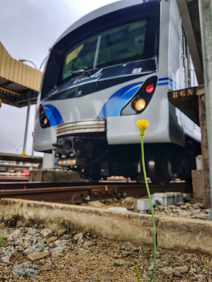 Marina Figueiredo – trem estacionado no pátio Jabaquara, com uma flor amarela à direita
