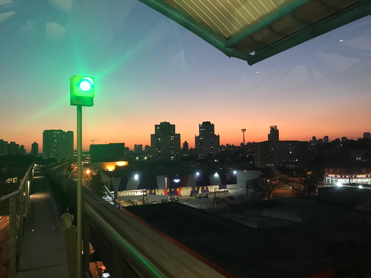 Katia Fidelis Moreira- Entardecer na Estação Oratório – vemos um sinal (farol) verde à esquerdam e a via na ponta da plataforma, com a cidade ao fundo com prédios e paisagem já escurecendo