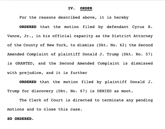 A federal judge DISMISSES President Trump's second attempt to block Manhattan DA Vance's probe and UPHOLDS the prosecutor's subpoena.
