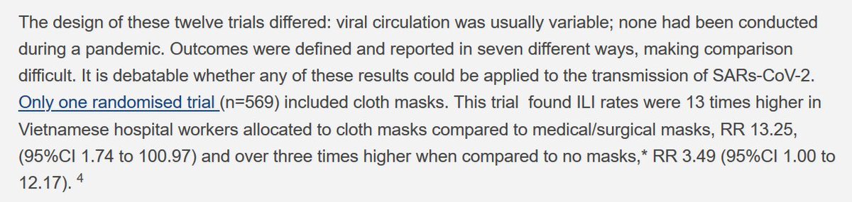 3/n Bien que mon interprétation soit que les très rares études de qualité (randomisées, non observationnelles) sur le port du masque soient plutôt en faveur d'un effet protecteur sur le porteur de masques chirurgicaux,