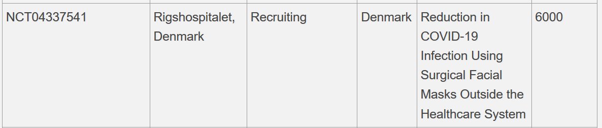 5/n Le peu d'études en cours, concernent plutôt les masques de protection pour les soignants et non les masques chirurgicaux en population et seule une étude, danoise, randomisée concerne le port de masques chirurgicaux en population générale.