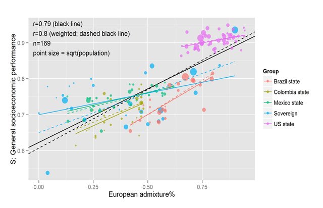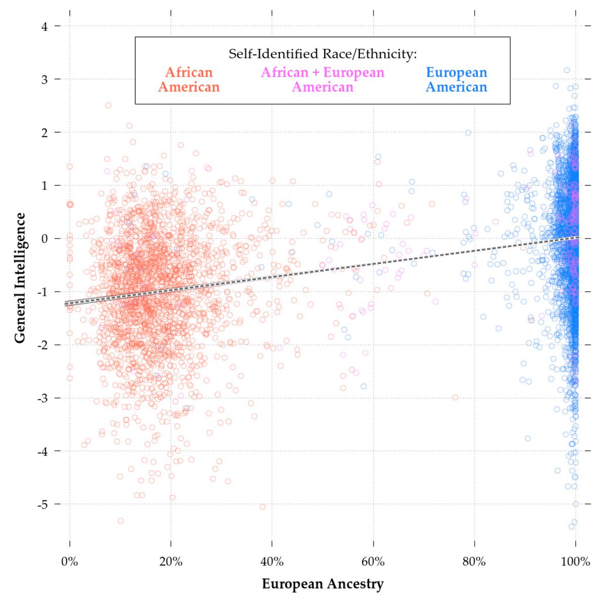 Here, European ancestry predicts intelligence no matter how people self-identify. It's a mystery!