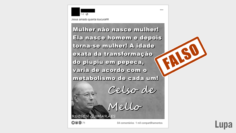Circula nas redes sociais uma frase atribuída ao ministro do STF Celso de Mello, na qual ele diz que “a mulher nasce homem e depois torna-se mulher”. Leia: bit.ly/2EaTq81. #AgênciaLupa#STF