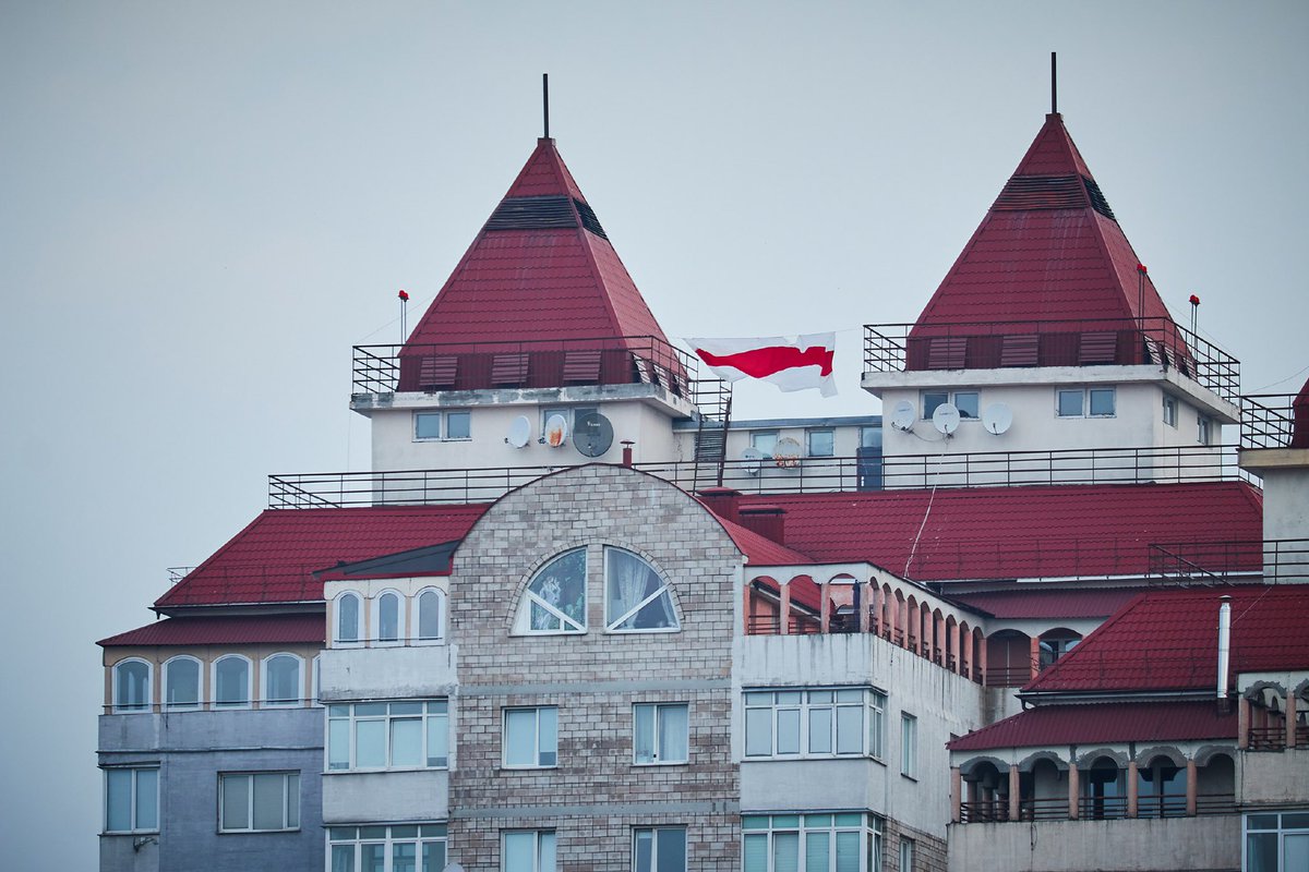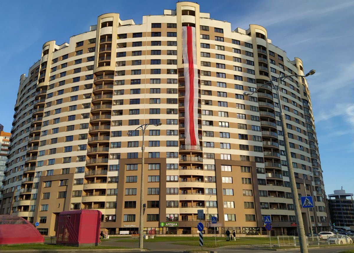 Huge white-red-white flags are spotted in residential areas of Minsk. This is how people express solidarity with the protesters.