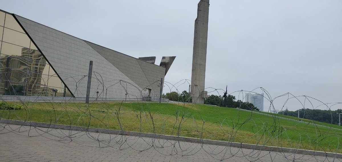 Barbed wire at the square in front of Minsk City Hero Obelisk where the rally was planned