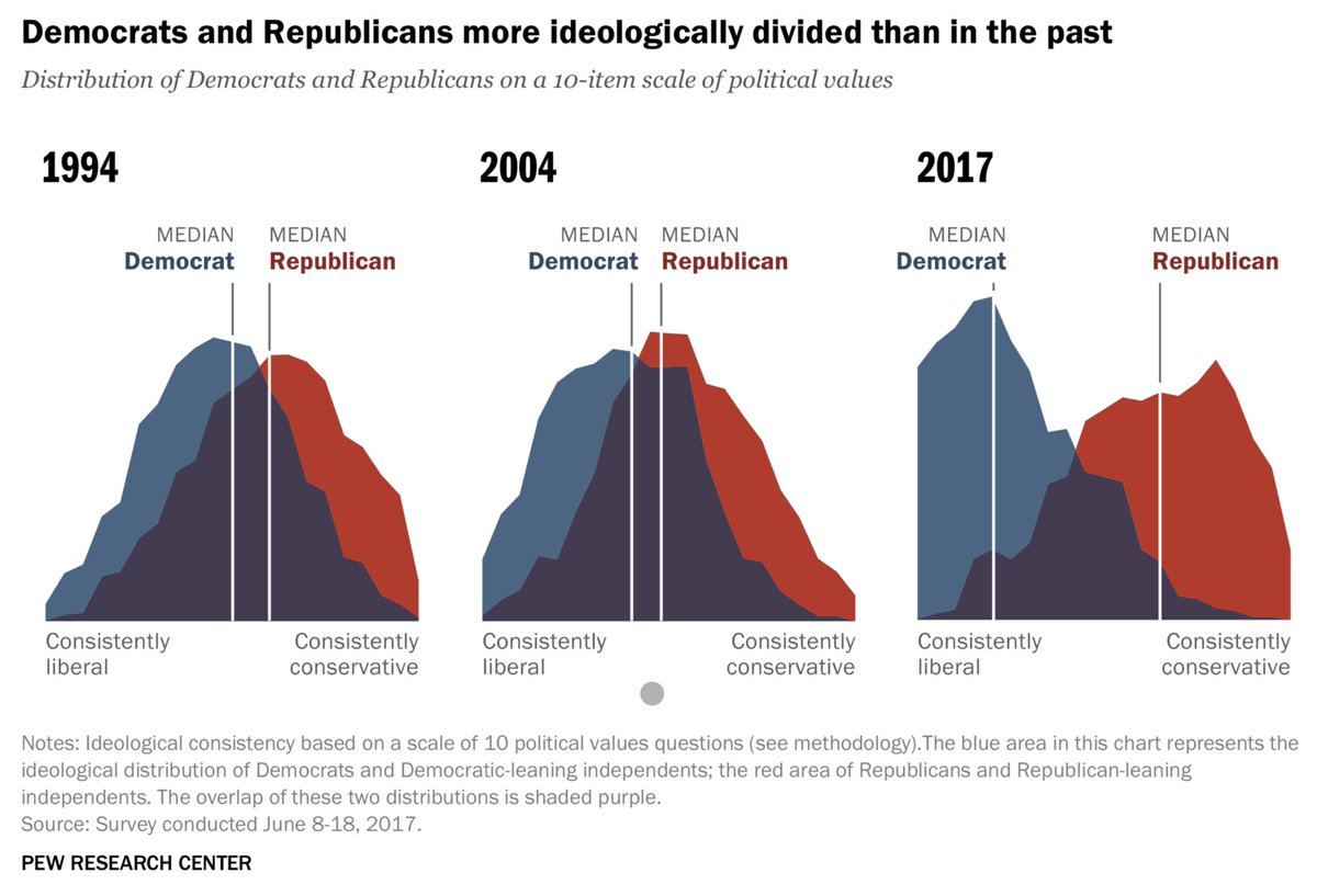 I’m afraid this chart doesn’t say what you think it does? It is from a 2017 Pew Research Center study on polarization, but it’s not showing how parties have moved from the center, it is showing how the space between the median Democrat and the median Republican has grown.