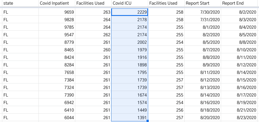 Florida ICU census from July 30/Aug 2 through Aug 20/23