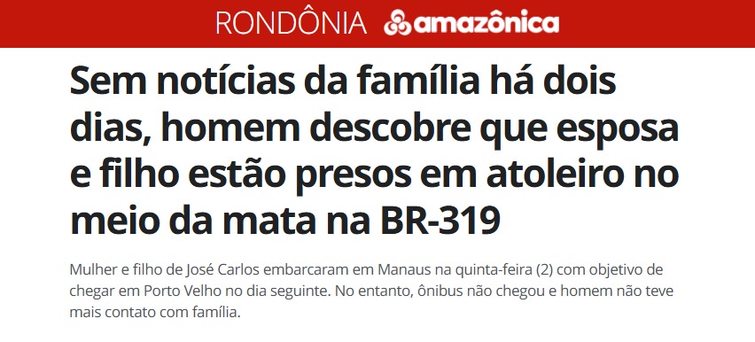 Quem viaja de Porto Velho e a Manaus precisa pegar uma BR sem asfalto, a 319. Este mês, a Justiça Federal suspendeu de novo a obra, atendendo recurso da ONG Observatório do Clima. Enquanto os ambientalistas andam de avião, a população enfrenta situações assim: