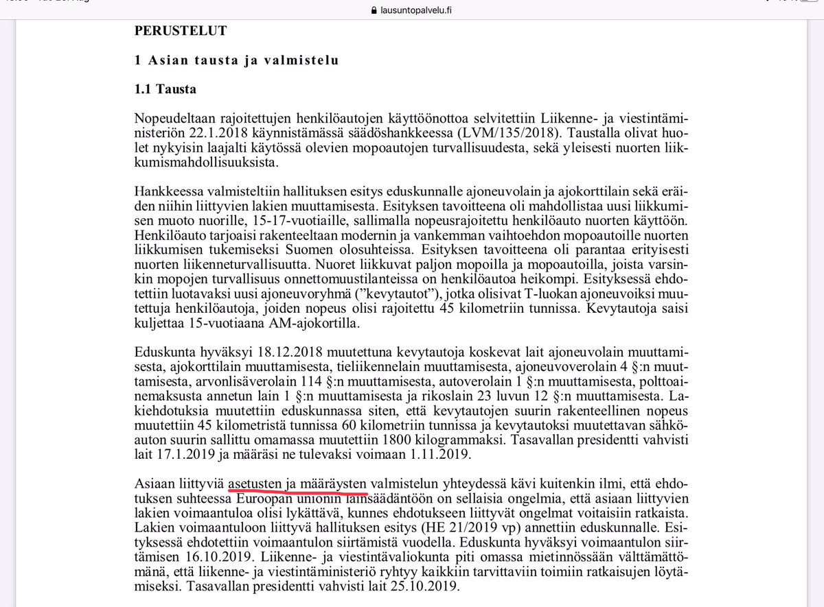 Erikoinen kulma tässä LVM:n viestinnässä ja jopa lausuntokierrokselle menneessä hallituksen esityksessä kevytautoista. Yritetään kaataa EU:n syyksi, vaikka todellisuudessa @lvmfi’llä meni lainvalmistelu totaalisen vihkoon. Prof Raitio kummasteli jo aiemmin yle.fi/uutiset/3-1099…