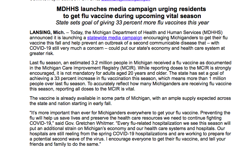 Gov. Whitmer starting this press conference making a public plea for Michigan residents to get vaccinated for the flu, especially educators and college students.