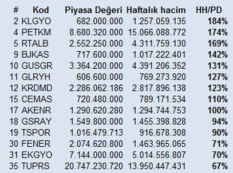 7 günlük işlem hacmi, şirketin tüm piyasa değerine kıyasla en yüksek; şirketin kendi boyutu kadar çok el değiştiren hisseler: