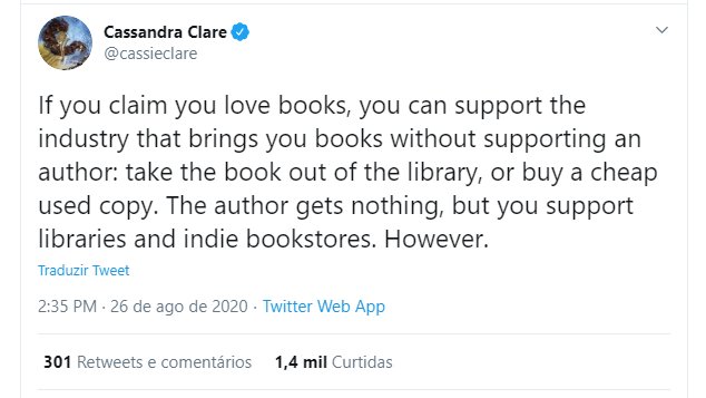 "Se você diz que ama livros, pode apoiar a indústria que traz os livros para você sem apoiar o autor: pegue o livro da biblioteca ou compre uma cópia usada barata. O autor não ganha nada, mas você apoia as bibliotecas e livrarias independentes."
