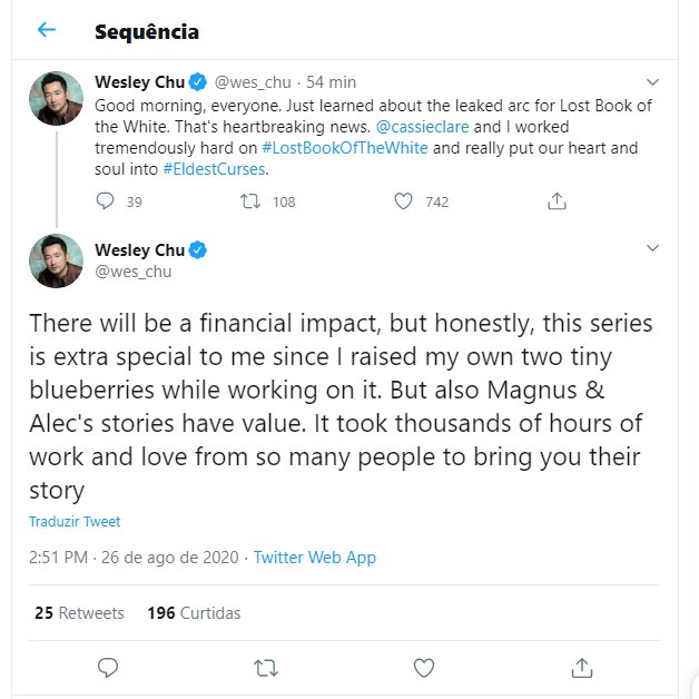 No último tweet de Cassandra Clare, ela se mostrou bastante chateada com toda a situação: "Tenho certeza que há mais a ser dito, mas tenho um prazo a cumprir. Vou lá escrever mais livros para idiotas piratearem."