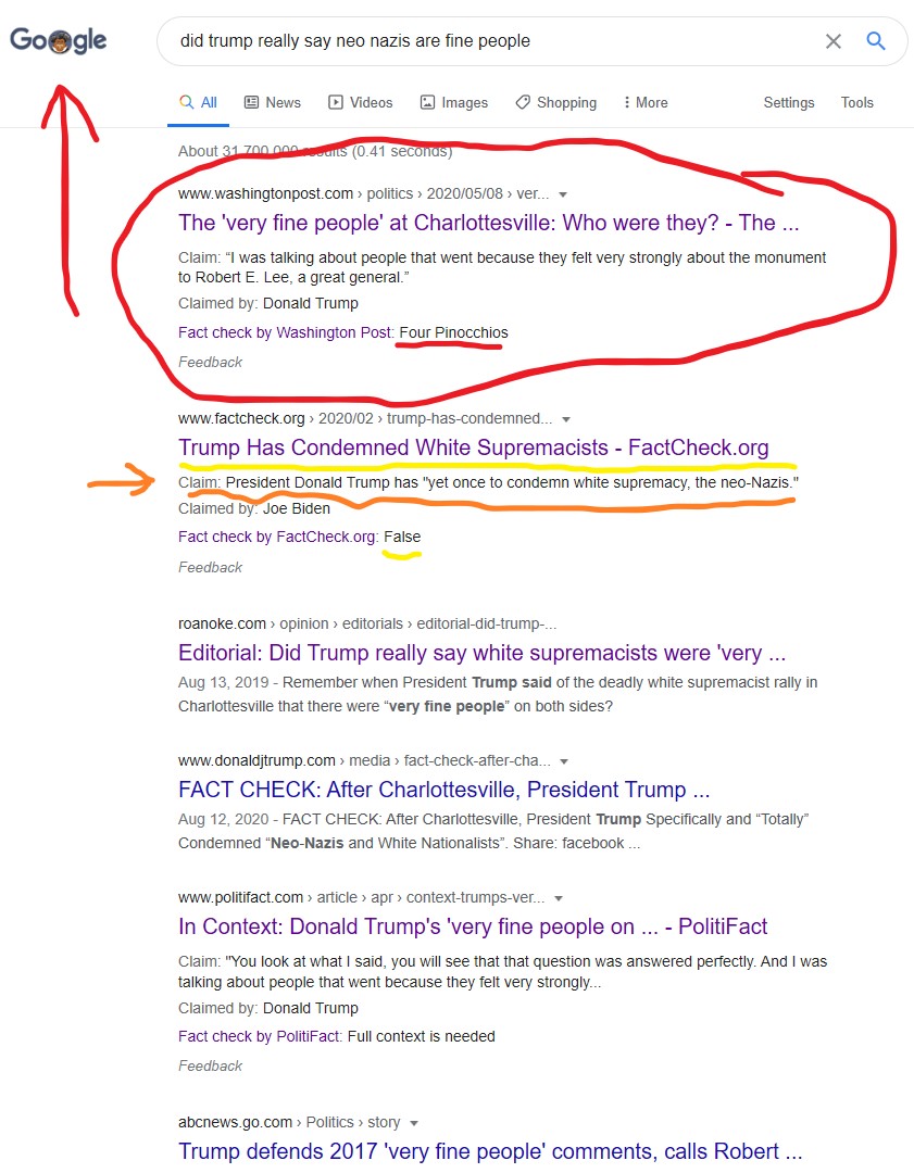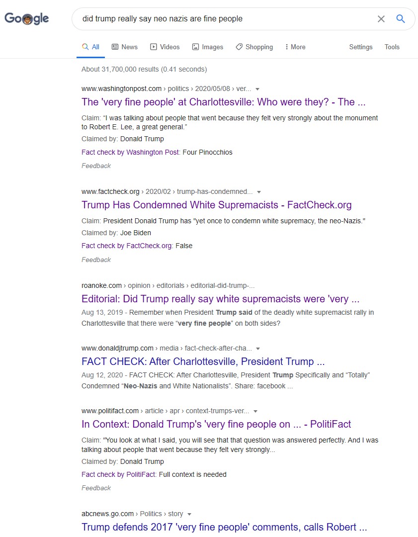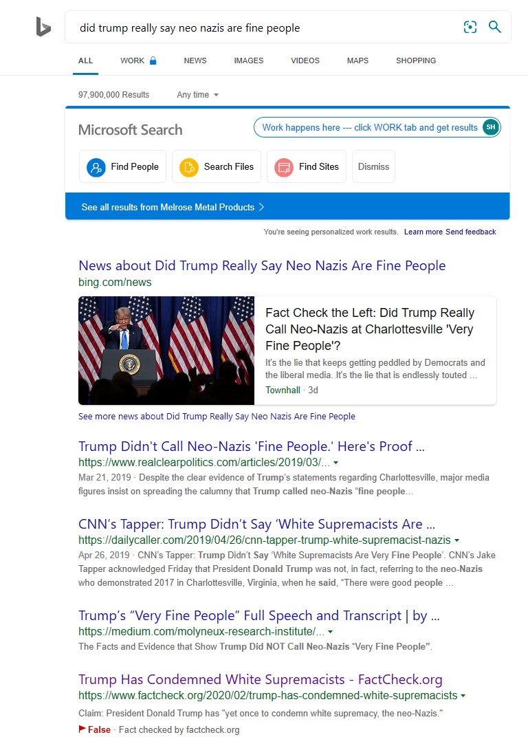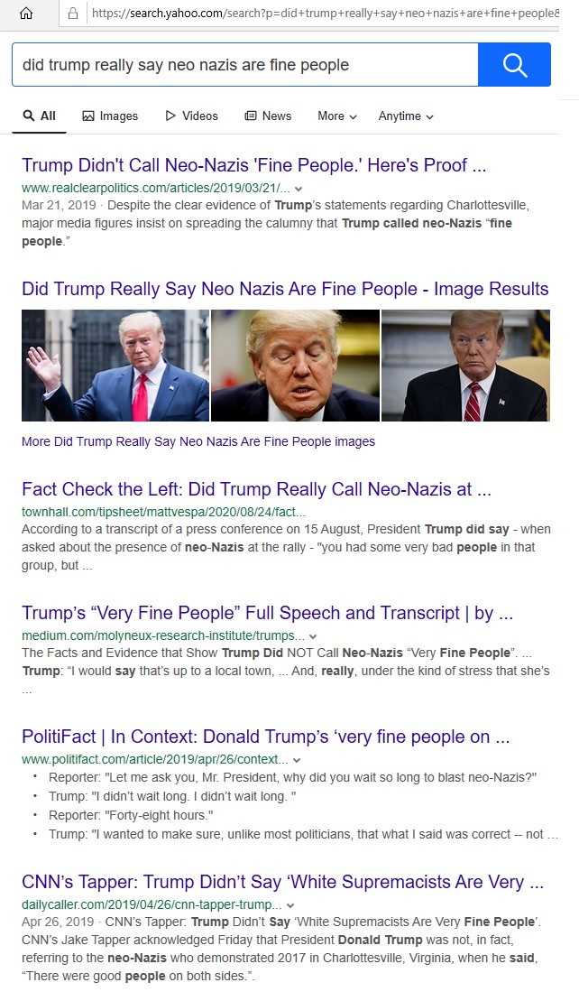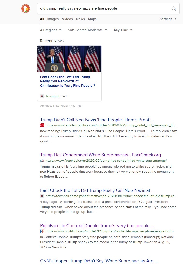 Each search engine uses "conservative" publications for the key word search "did trump really say neo nazis are fine people," except Google.
