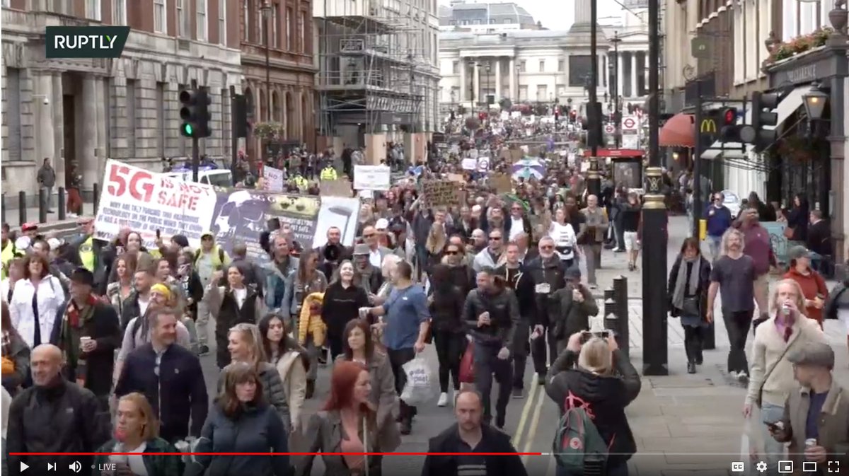 Back to London. Q sigin in the background. "No forced vaccines", "Agenda 21" and "5G is not safe" banners also spotted. If you come across any QAnon banners/signs from marches in your town/city/country today, please DM me!