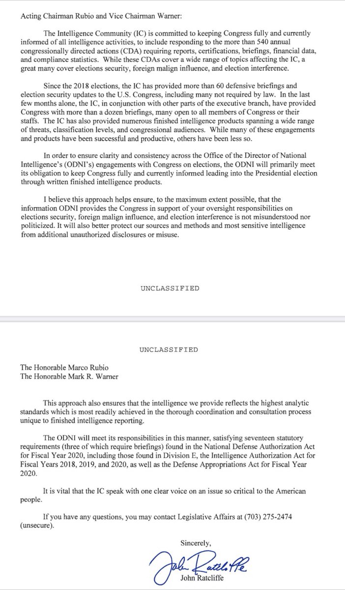 “We are concerned about unauthorized disclosures of sensitive information following recent briefings. The DNI is committed to ensuring Congress is fully and currently informed and that classified information is protected.”
