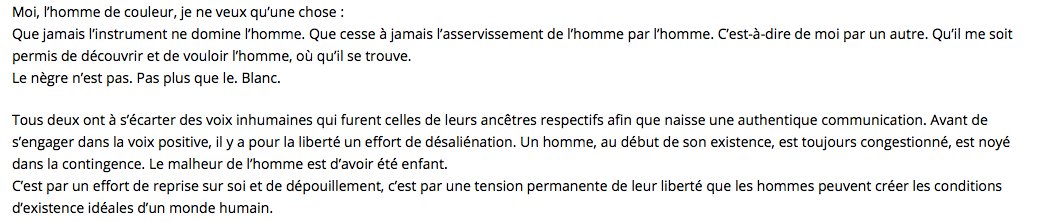 Franz Fanon, hérault de la pensée de la colonisation, refusait l’essentialisation en Noir ou Blanc, leur opposition violente, relative, irréductible. Il l’a fait au nom de la liberté, de l’humanisme et de l’universel. Thread