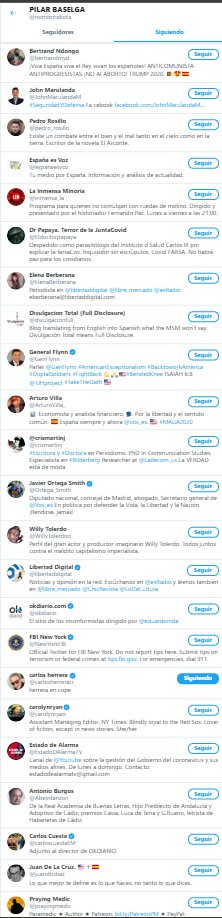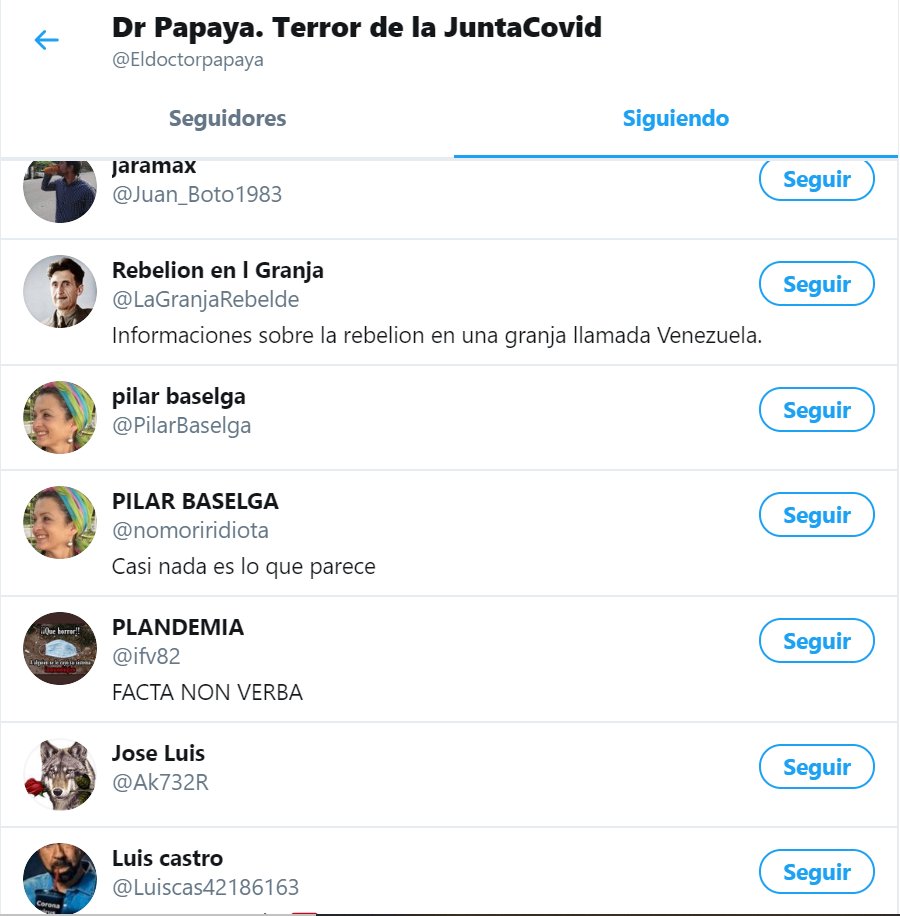 Baselga, por su parte, apoya a Médicos por la Verdad como ya hemos visto, sigue al propio Doctor Papaya y también a varias cuentas de v0x