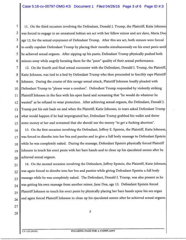 🧵 This is the lawsuit attorney @LisaBloom filed on behalf of #KatieJohnson. It was filed on April 26, 2016, and dropped after multiple death threats on Nov 4, 2016...just 4 days before the election when Trump was also paying off a porn star and a girlfriend he was cheating on his wife with for over a year. This details what Trump did to a then 13-year-old Katie in 1994. I do have her location and I'm not giving up on her.