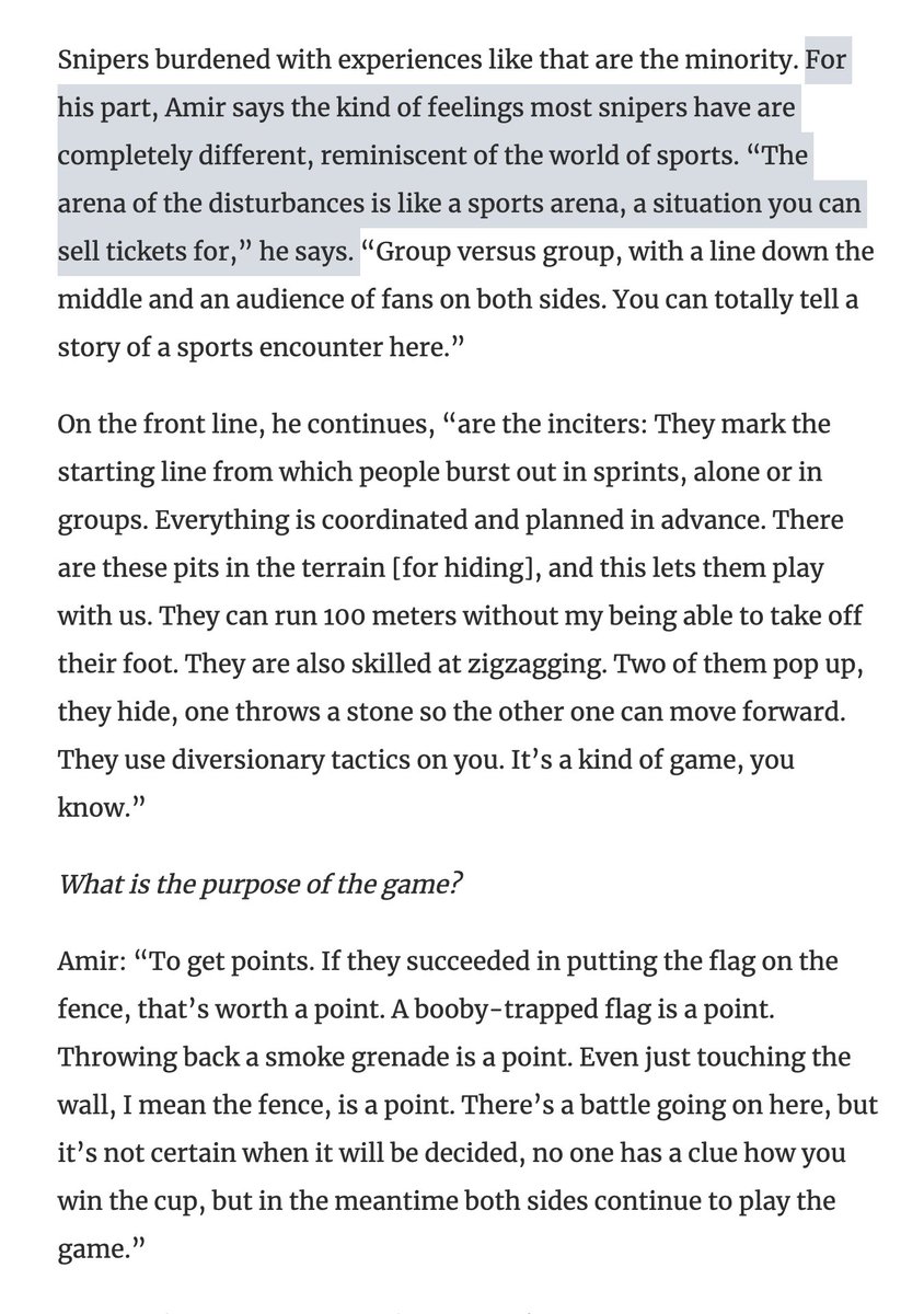“Let me just once take down a kid of 16, even 14, but not with a bullet in the leg – let me blow his head open in front of his whole family and his whole village. Let him spurt blood. And then maybe for a month I won’t have to take off another 20 knees”— Amir, IDF sniper, 2020