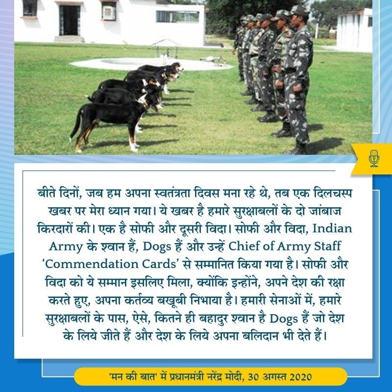 PM Modi recognizes the two Bravehearts of our security forces- Sophie and Vida. They are the dogs of the Indian Army who have been awarded the Chief of Army Staff ‘Commendation Cards’ for playing an important role in protecting the country.